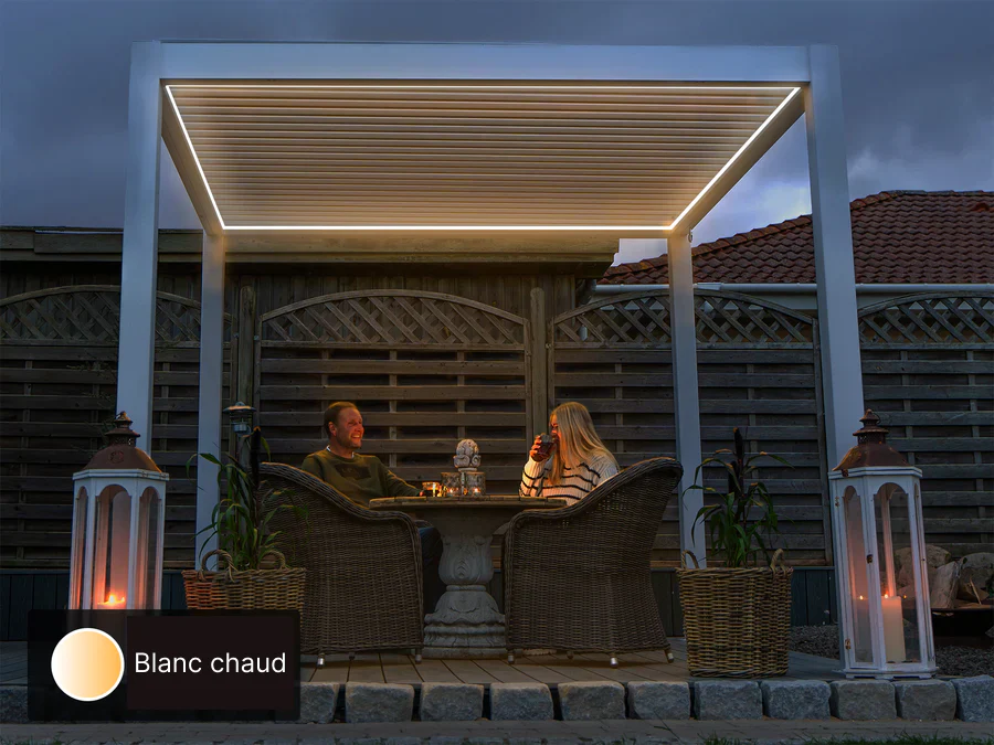 Créez l'atmosphère idéale pour vos soirées d'été et d'automne grâce aux toutes nouvelles bandes LED Pergolux, conçus spécialement pour nos pergolas PERGOLUX. Ces bandes sont facilement insérées dans le rail de gouttière de votre pergola pour un éclairage discret et élégant.