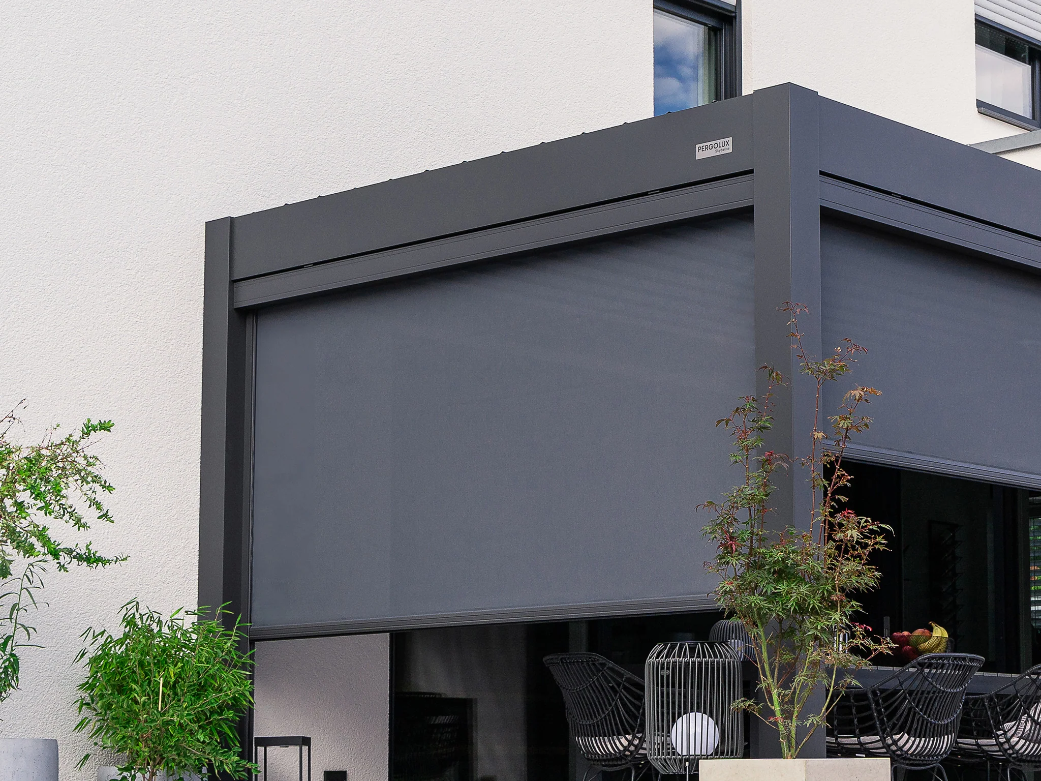 Conçu pour correspondre parfaitement à votre pergola, disponible en blanc ou gris anthracite, et compatible sur les quatre côtés pour un espace entièrement clos.